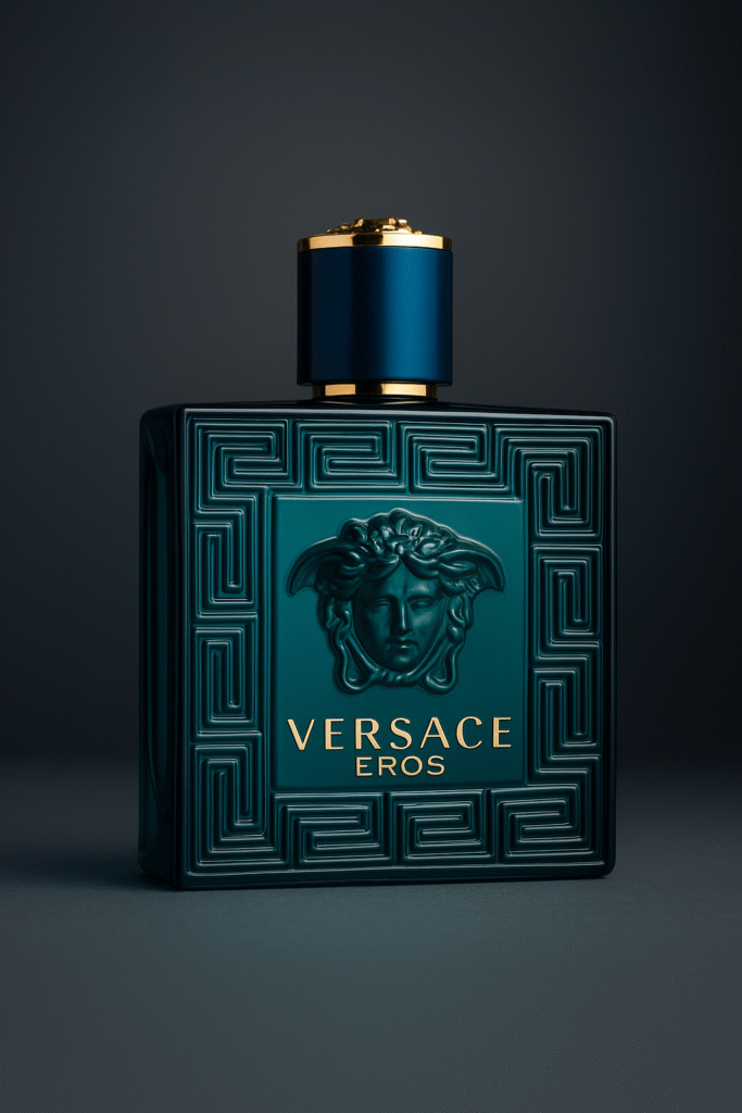 O frasco do perfume Versace Eros é uma verdadeira joia. Azul profundo, adornado pelo icônico emblema da Medusa, transmite luxo, desejo e magnetismo. Uma peça que, além de fragrância, é também um símbolo de poder visual.